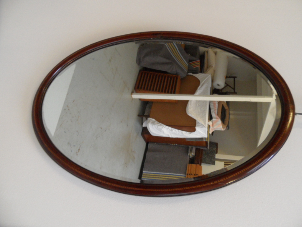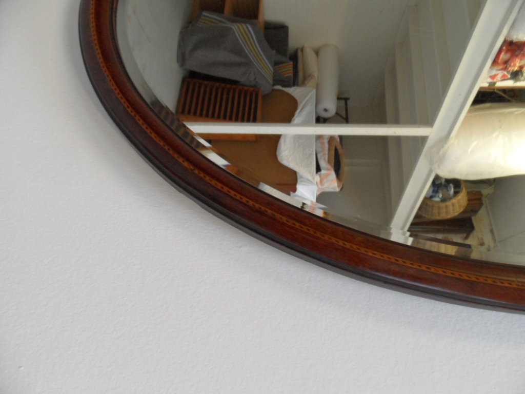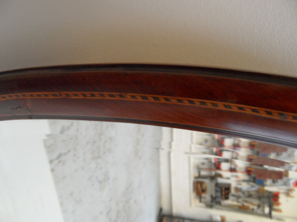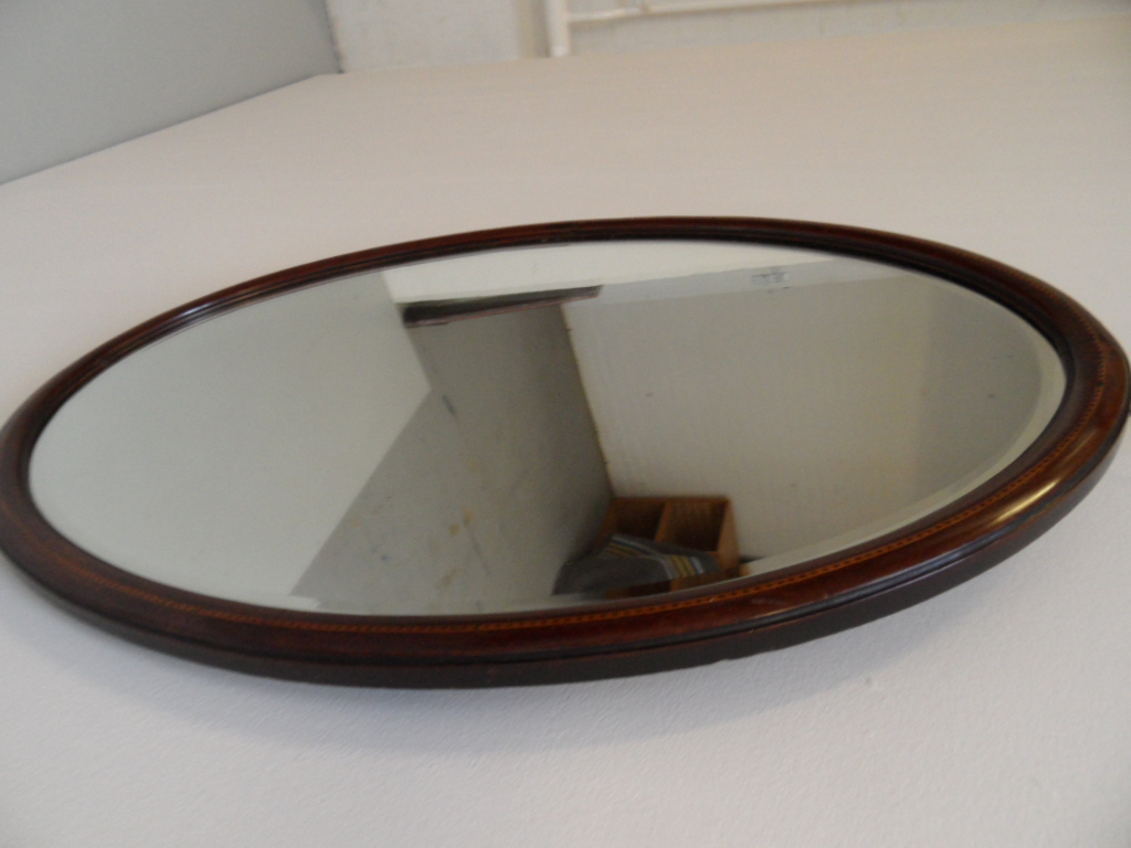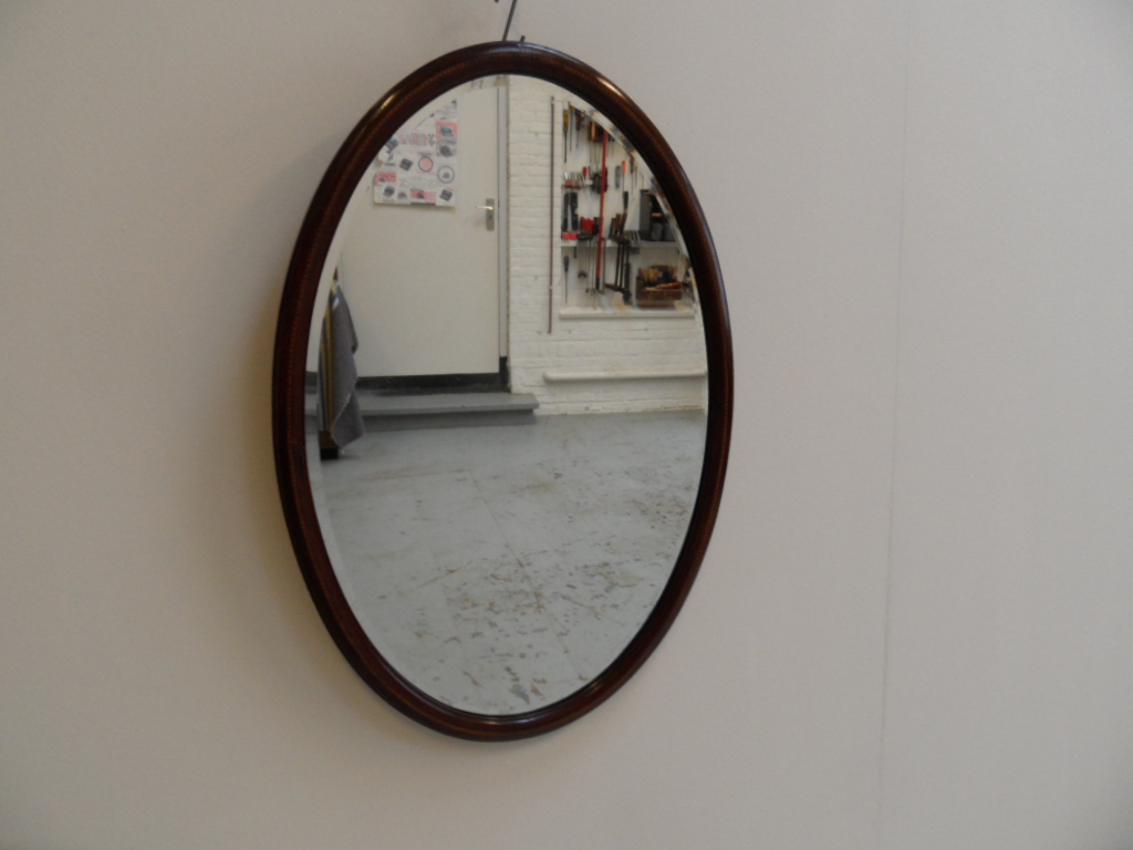 Antieke ovale mahoniehouten spiegel met inlegwerk. Gemaakt rond 1880. In zeer goede staat. Met facet geslepen spiegel!