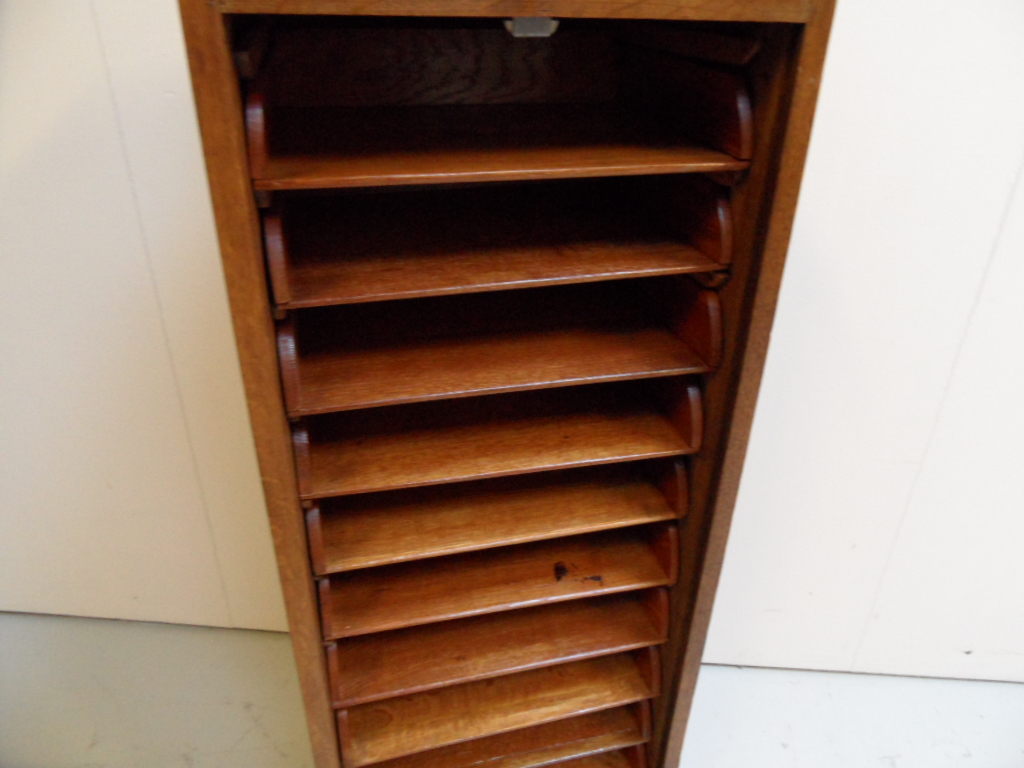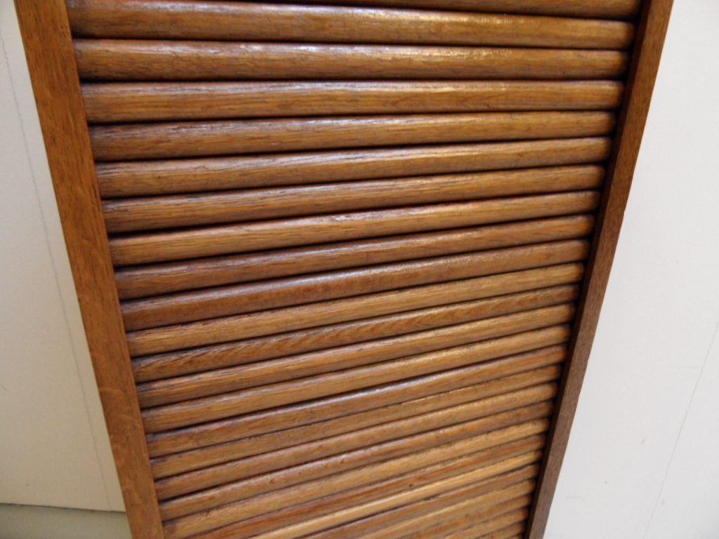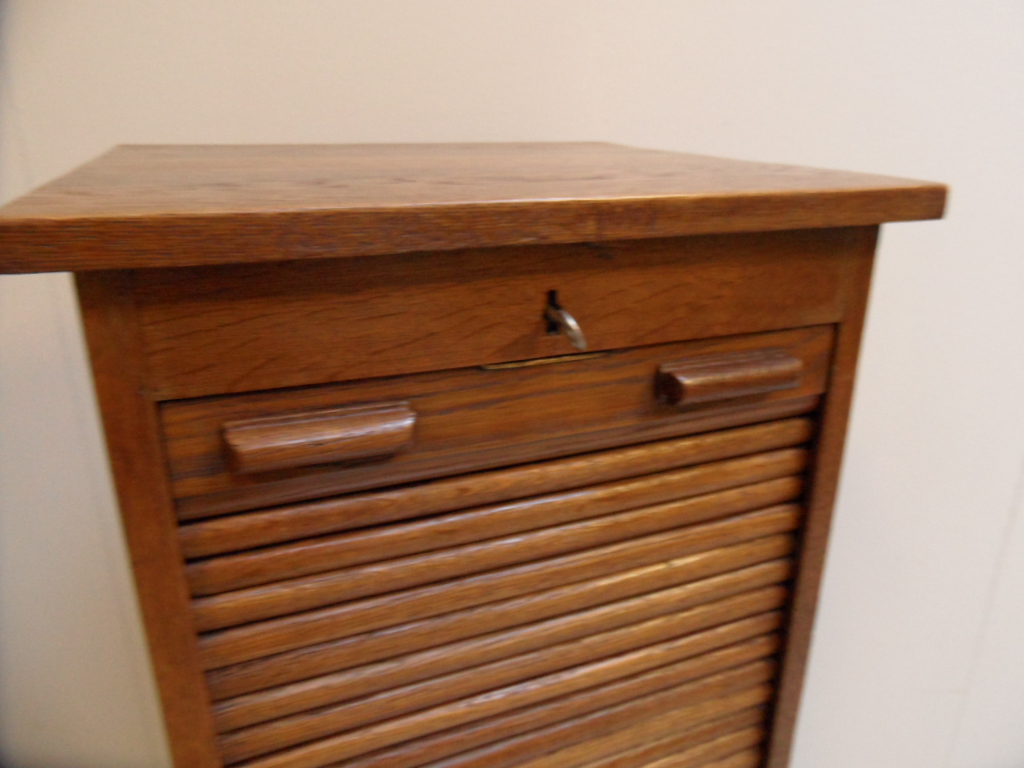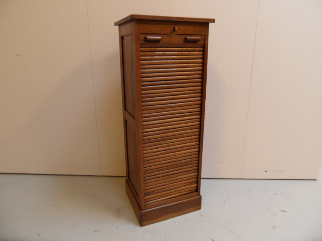 Antieke rolluikkast met lades. Soepel lopend rolluik. Goed afsluitbaar. In zeer goede staat. Gemaakt van eiken. Rondom panelen; kast is daardoor vrij in de ruimte te plaatsen!