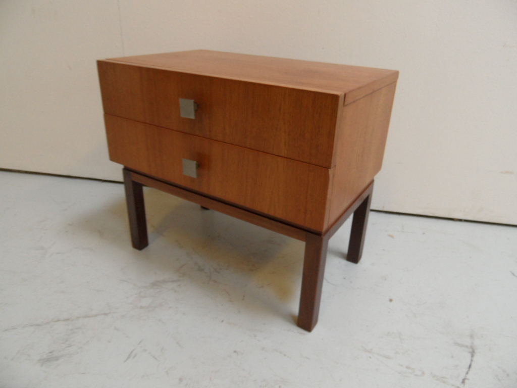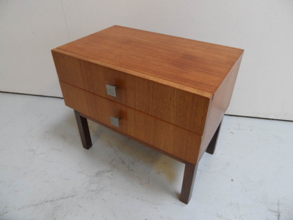 Mid Century teakhouten ladekastje met 2 lades. In zeer goede staat. Gemaakt beginjaren 50.
