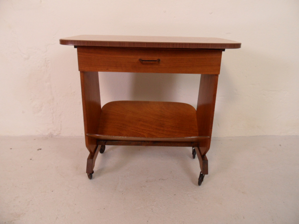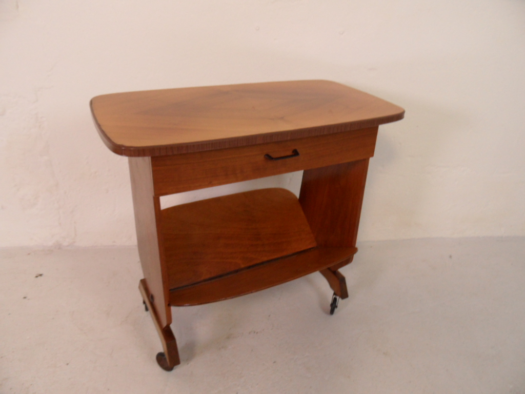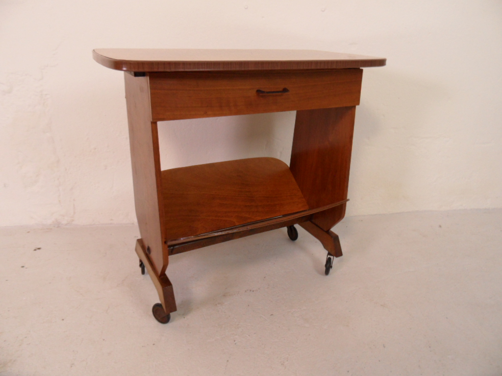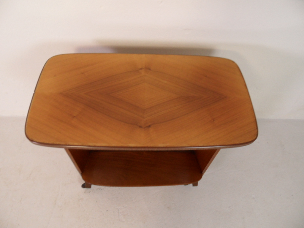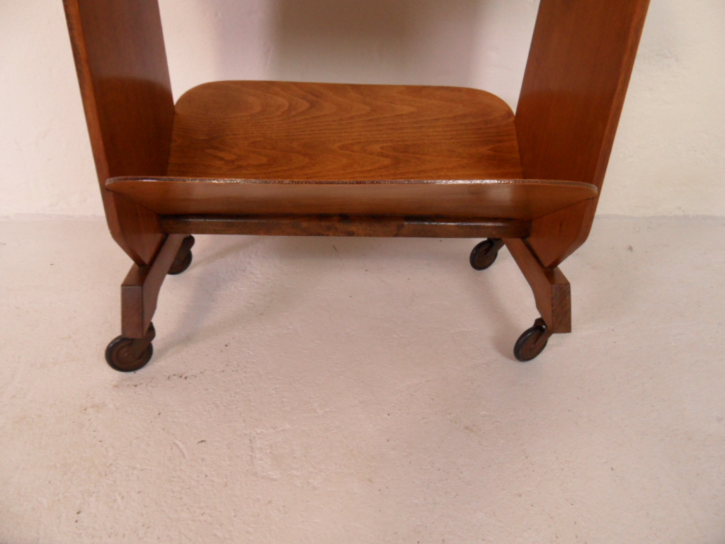 Vintage notenhouten tijdschriften trolley op wielen. In zeer goede staat. Gemaakt in Nederland in de beginjaren 50.